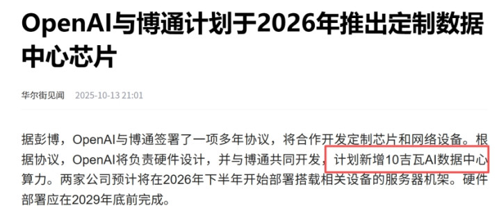 最新消息,OpenAI与博通计划于2026年推出定制数据中心芯片,部署10吉瓦的OpenAI设计的AI加速器。OpenAI和Broadcom将共同开发系统,其中包括Broadcom的加速器和以太网解决方案,用于纵向扩展和横向扩展。博通将部署人工智能加速器和网络系统机架,计划于2026年下半年开始,并于2029年底完成。
