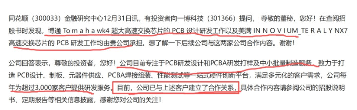 博通供应商:与博通保持着十余年的长期合作关系,为博通提供PCB定制服务,包括PCB设计、制板、元器件供应、PCBA焊接组装、性能测试等一站式硬件创新服务。同时担了博通Tomahawk 4超大高速交换芯片的PCB设计研发工作。