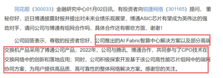 博通供应商:公司与博通在多个方面有着深入合作。双方联合推出了AI Fabric智算中心网络解决方案,采用博通Tomahawk 4交换芯片,支持25.6Tbps CPO交换系统。同时,2022年锐捷网络与腾讯、博通合作,共同参与了CPO技术在交换网络中的创新和落地应用。