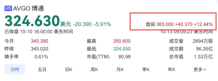 10月13日盘前,另一AI芯片龙头博通股价盘前暴涨潮12%。